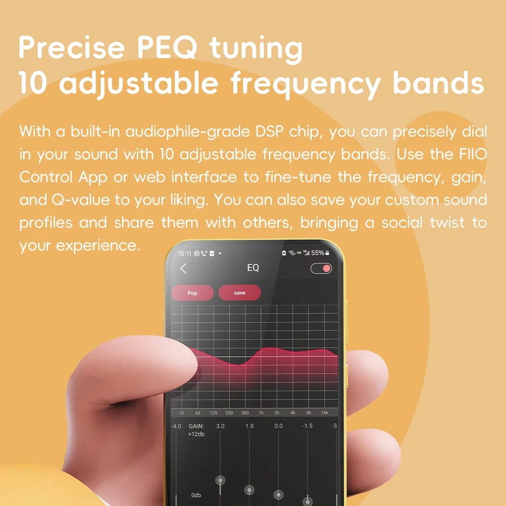 Verwenden Sie die FIIO Control App oder die Webschnittstelle, um die Frequenz, die Verstärkung und den Q-Wert nach Ihren Wünschen fein abzustimmen.