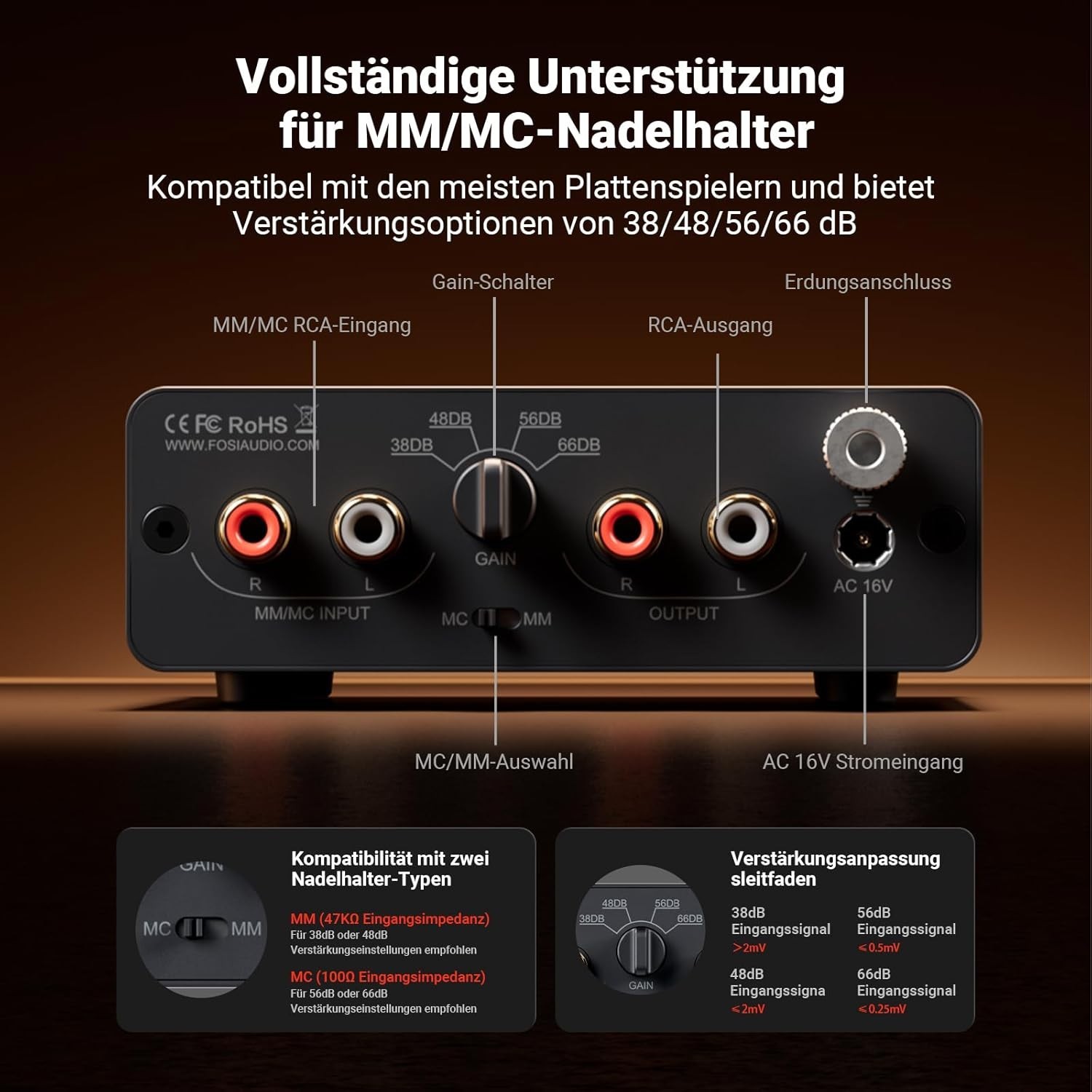 Mit einer 4-stufigen Verstärkungsregelung mit Einstellungen von 38/48/56/66 dB ist der Vorverstärker sowohl für MM- als auch für MC-Tonabnehmer geeignet und erfüllt somit eine Vielzahl von Anforderungen.