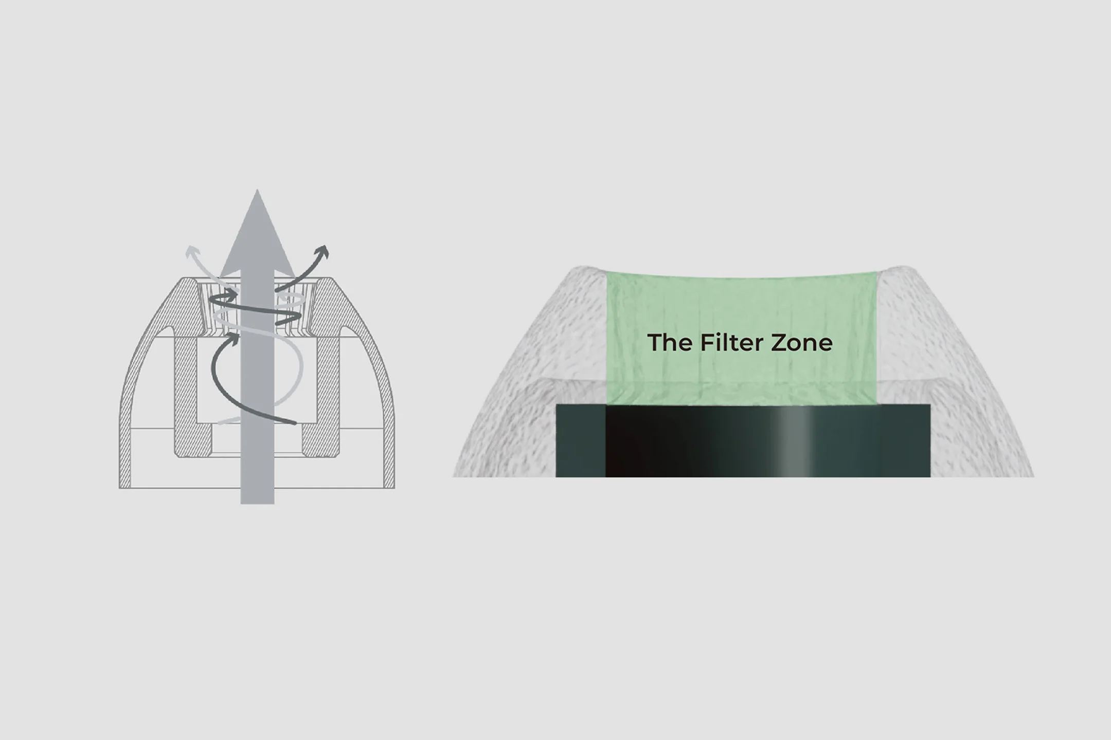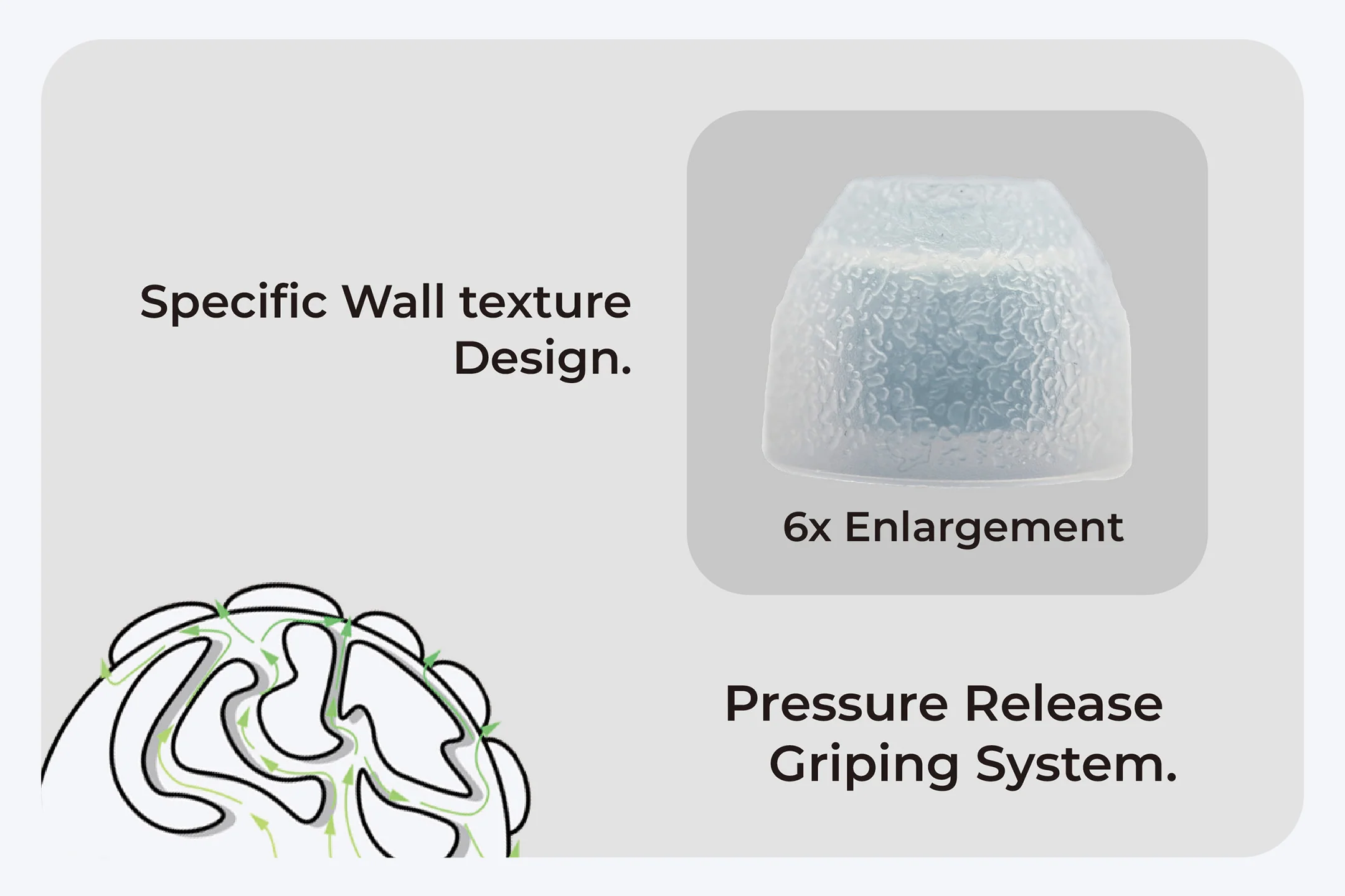 Die Innenwand der Ohrstöpsel ist mit einem Kreis aus geraden Zahnrillen versehen, die die Ausbreitung der Schallwellen mit Schallgeschwindigkeit erleichtern. Gleichzeitig werden unerwünschte hohe und tiefe Frequenzen zerstreut, Geräusche herausgefiltert und ein reinerer, natürlicherer Klang erzeugt, der eine breitere Klangbühne schafft.