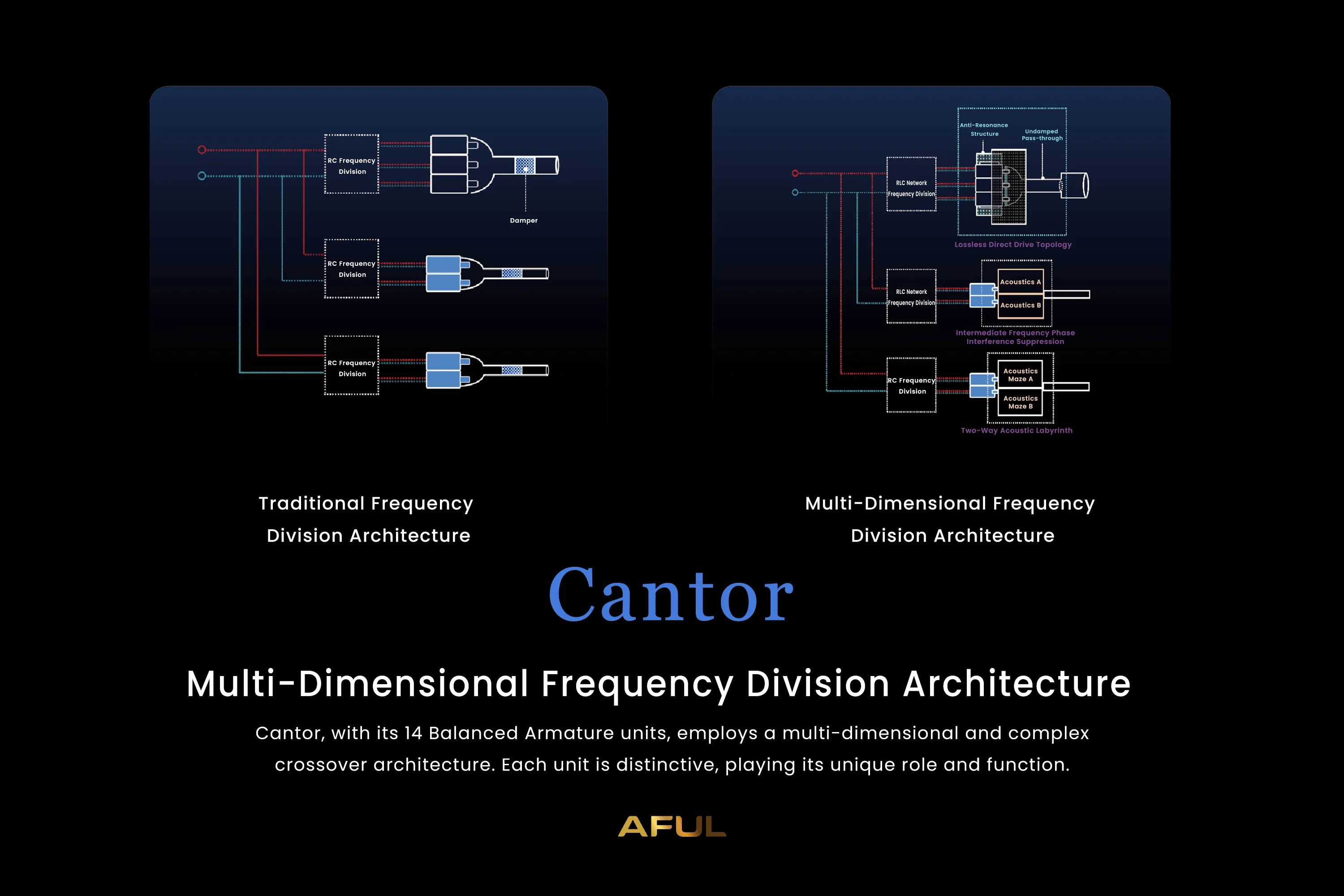 Die multidimensionale Frequenzteilungsarchitektur des AFUL Cantor integriert 14 BA-Treiber, die jeweils eine spezifische Funktion haben, um ein zusammenhängendes Klangbild mit sanften Frequenzübergängen und ein umfassendes, ausgewogenes Klangerlebnis zu liefern.