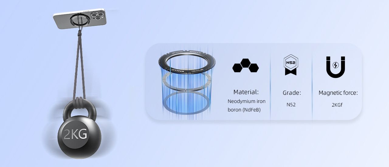 Die 17 Neodym-Eisen-Bor-Magnete der Güteklasse N52 mit einer magnetischen Anziehungskraft, die mit der Kraft von 2 Litern Wasser vergleichbar ist, sorgen dafür, dass der MagClip in jeder Situation sicher befestigt bleibt.