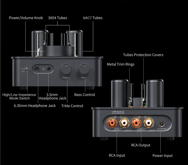 Er unterstützt die Umschaltung zwischen Modus für niedrige und hohe Impedanz, um Kopfhörer mit 16 Ω bis 300 Ω anzuschließen, und verfügt über 6,35-mm-/3,5-mm-Kopfhörerbuchsen an der Vorderseite und Cinch-Ein-/Ausgänge an der Rückseite für die Integration in Heim-HiFi-Systeme.