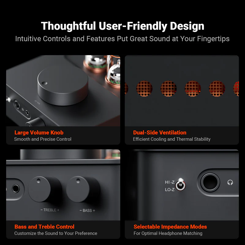 Dieser Röhren-Kopfhörerverstärker verfügt über intuitive Bedienelemente, darunter einen großen Lautstärkeregler, beidseitige Belüftungsöffnungen, Bass- und Höhenregler sowie eine Umschaltung zwischen hohem und niedrigem Impedanzmodus, wodurch er vielseitig einsetzbar ist.