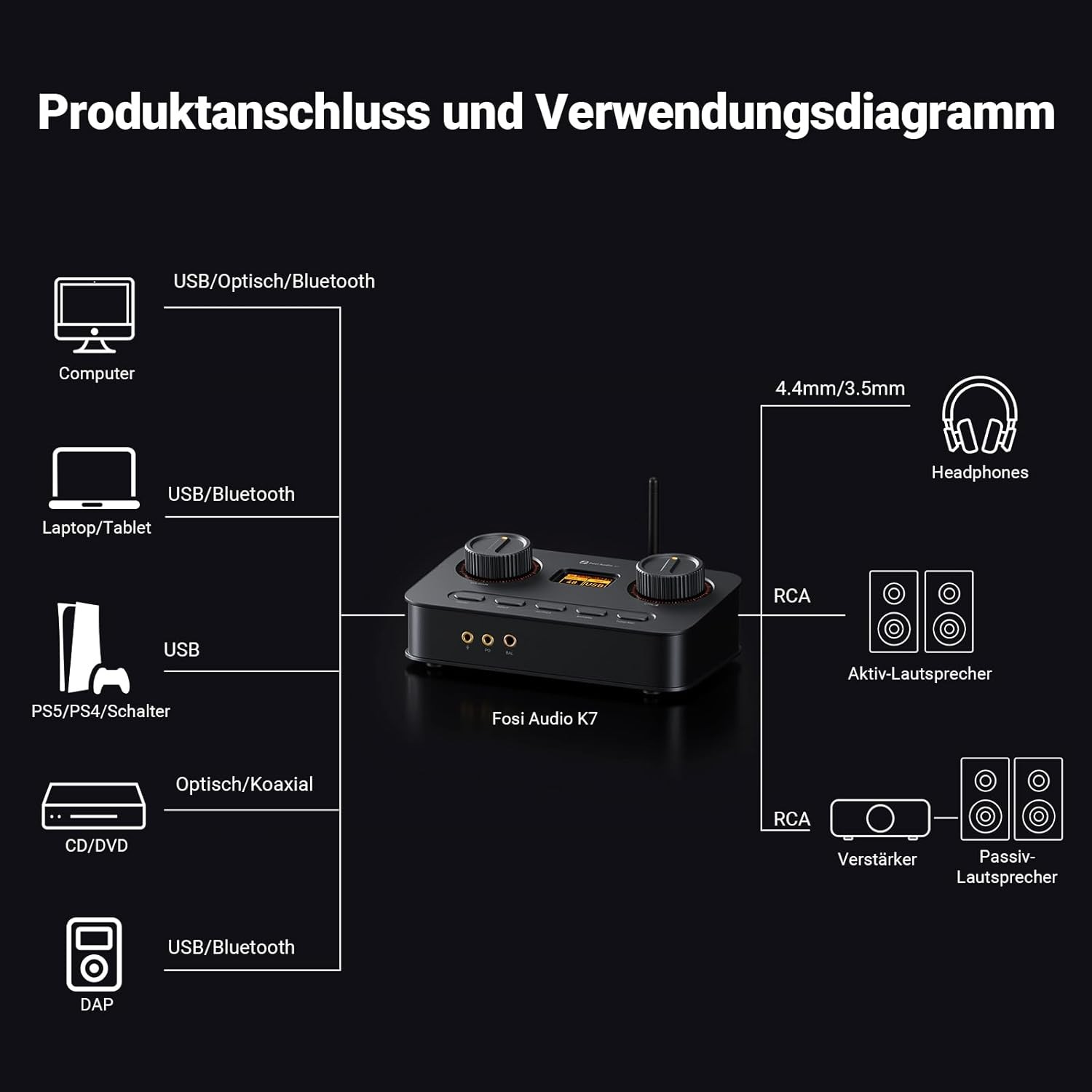 Der K7 ist sowohl für HiFi-Kopfhörer als auch für Musikliebhaber konzipiert. Er kann als leistungsstarke Schaltzentrale für Ihr Desktop-Audiosystem dienen. Ob Sie Musik genießen, spielen oder arbeiten, der K7 bewältigt alles mit Leichtigkeit.