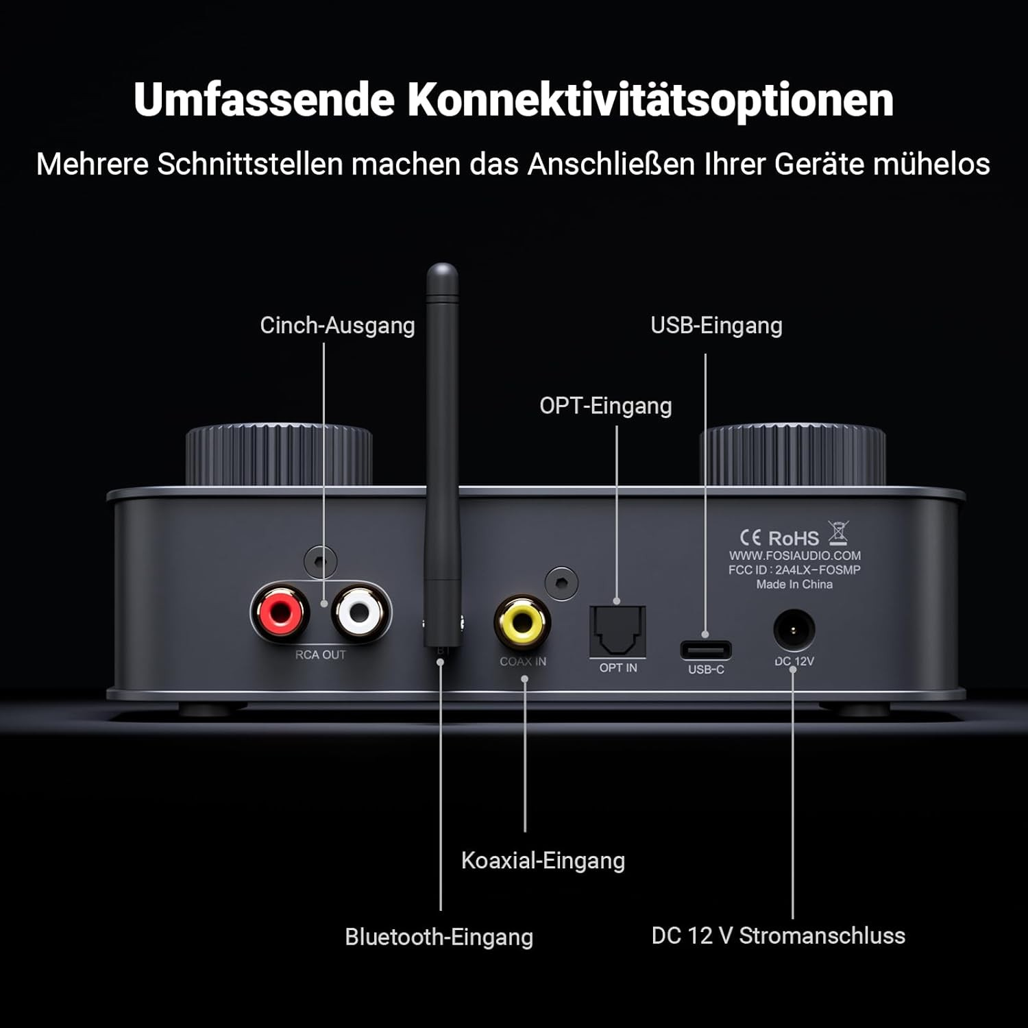 Eingang: Koaxial, Optisch, USB-C, Bluetooth, 3,5 mm Mikrofon