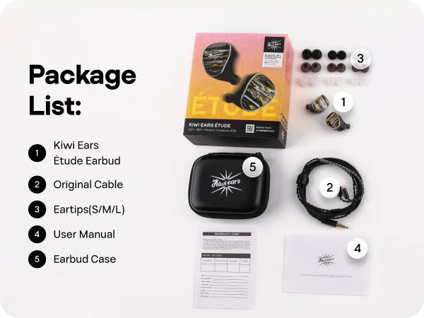 Kiwi Ears hat den Étude sorgfältig entwickelt, um eine ideale Klangbalance zu erreichen, die sowohl Präzision als auch Musikalität bietet. Der Subbass wurde um 8 dB angehoben – stark genug, um Tiefe zu verleihen, ohne die Klarheit zu überlagern. Eine 250-Hz-Frequenzweiche sorgt dafür, dass der Mitteltonbereich flach und neutral bleibt und der natürliche Charakter von Stimmen und Instrumenten ohne Verfärbungen erhalten bleibt. Die Höhen sind fein abgestimmt für Komfort und Resonanz und runden den raffinierten und ausgewogenen Klangcharakter des Étude ab.