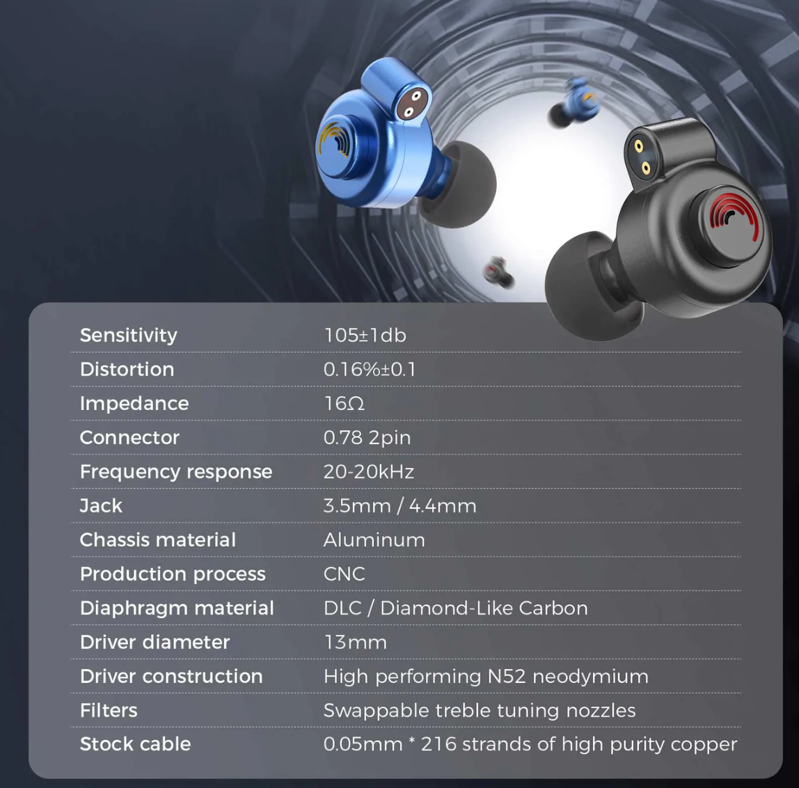 Das bemerkenswerteste Merkmal des D13 ist sein sanftes Klangprofil, das auf die große DLC-Membran und die N52-Neodym-Magneten zurückzuführen ist. Er hat einen straffen Bass, klare Mitten und schimmernde Höhen, ohne zu ermüden. Es handelt sich um einen innovativen dynamischen Treiber, der vom Shuoer Akustik-Team entwickelt und hergestellt wurde.