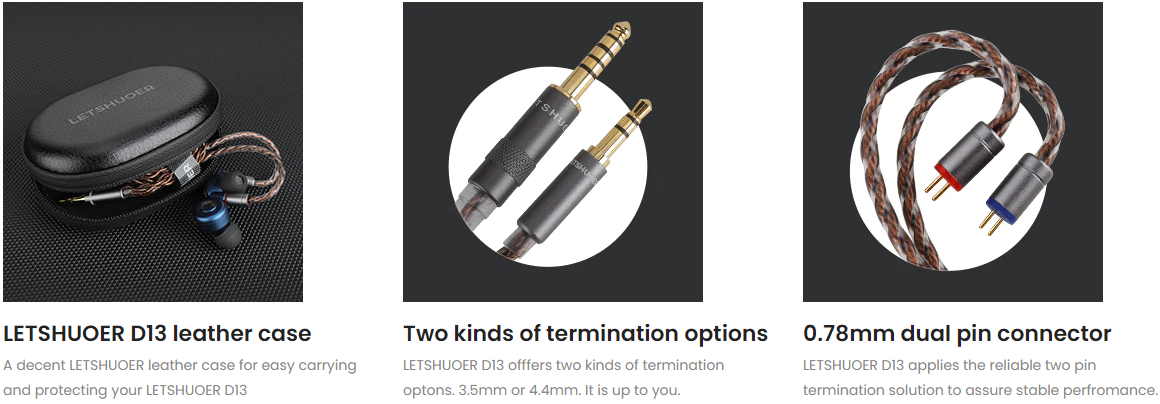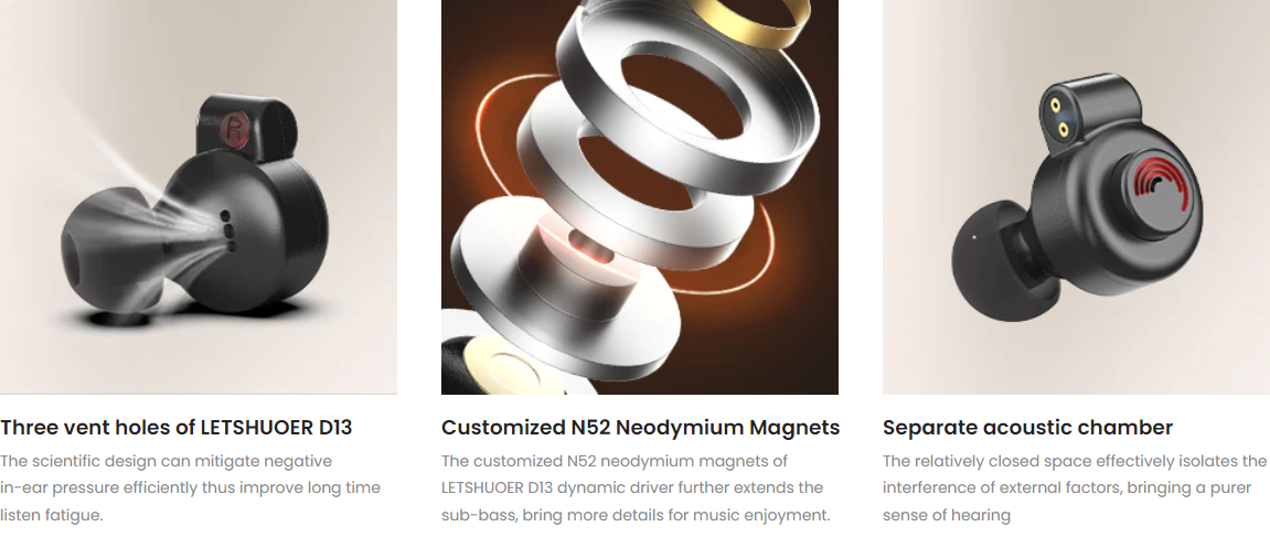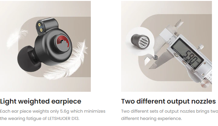 LET SHUOER D13 ist das neue IEM mit dynamischem Treiber, entwickelt und hergestellt von Shuoer Acoustic Technology Company Limited. Es ist mit einer kundenspezifischen 13mm DLC-Membran ausgestattet, die die neue F&E-Erfüllung unseres Teams ist. Es ist ein innovatives dynamisches Treiber IEM oder Moving Coil Kopfhörer für audiophile und Musikliebhaber gefertigt. Das ergonomische Design des LETSHUOER D13-Gehäuses und der Ohrbügel sorgen für hohen Tragekomfort.