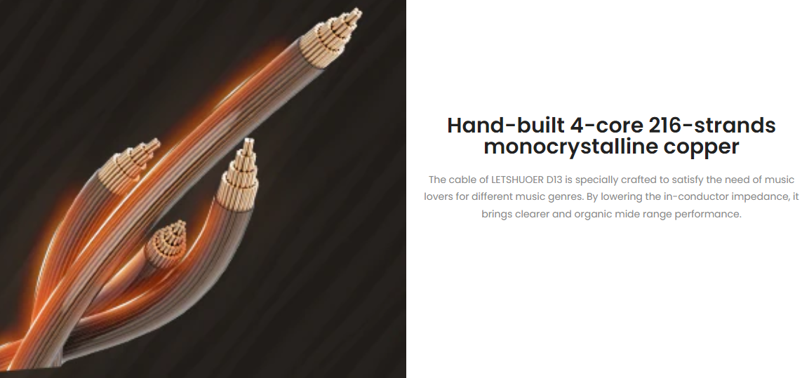 Das Kabel des LETSHUOER D13 wurde speziell entwickelt, um die Bedürfnisse von Musikliebhabern verschiedener Musikgenres zu erfüllen. Durch die Verringerung der Impedanz im Leiter sorgt es für eine klarere und organische Leistung im mittleren Frequenzbereich.