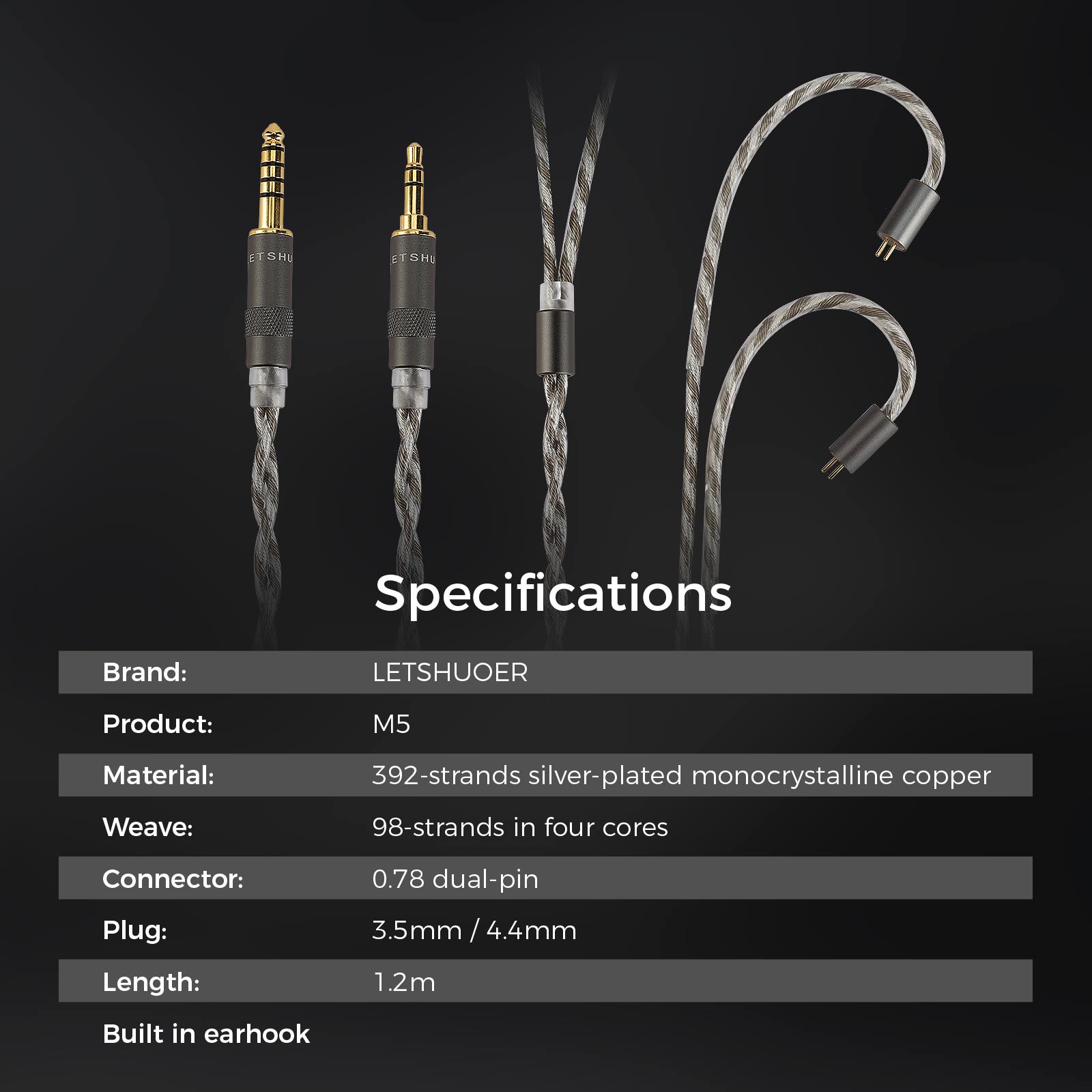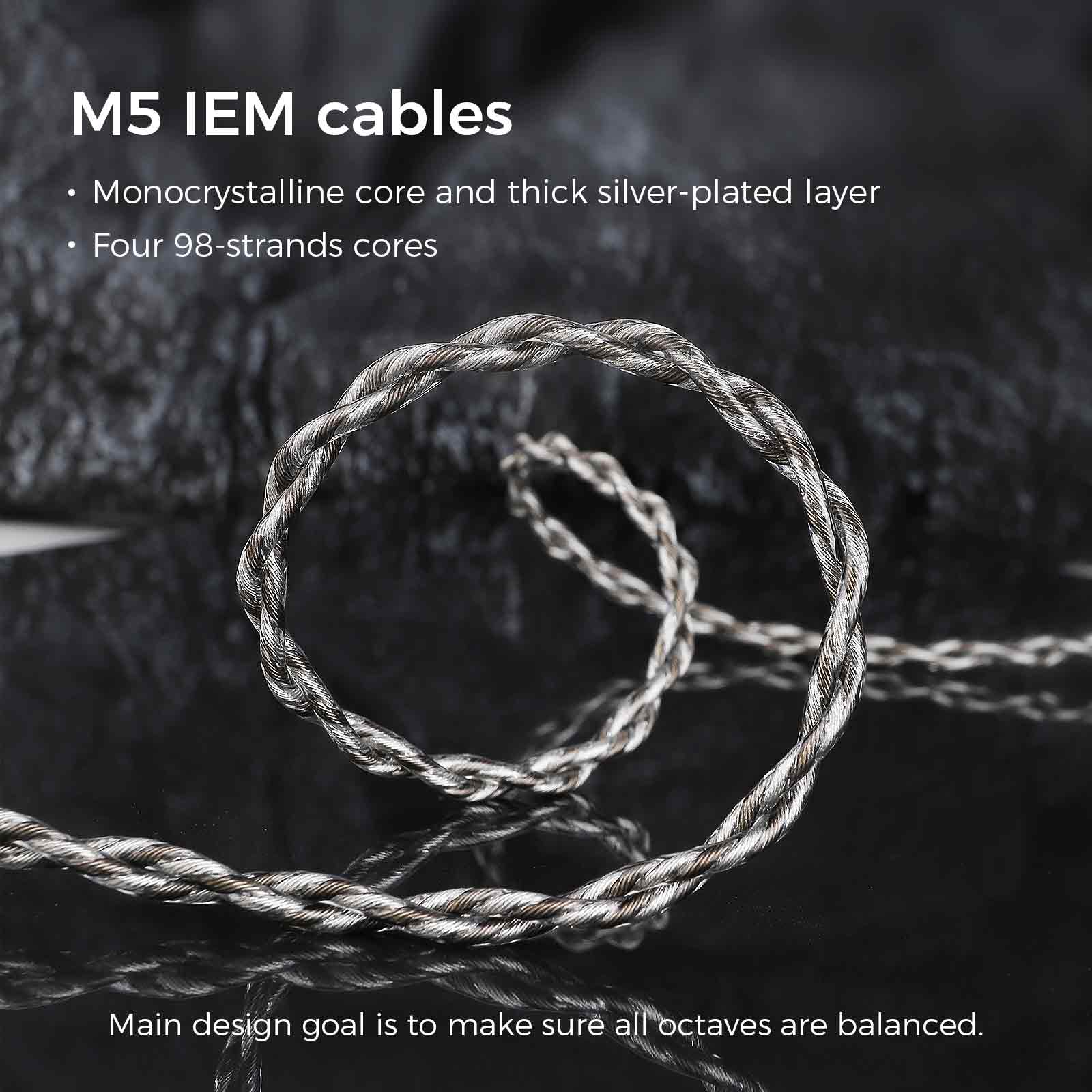 Let Shuoer M5 ist mit monokristallinem Kern und dicker versilberter Schicht aufgebaut. Es ist mit vier 98-strängigen Kernen aufgebaut. Das Hauptziel des Designs ist es, sicherzustellen, dass alle Oktaven ausgeglichen sind.