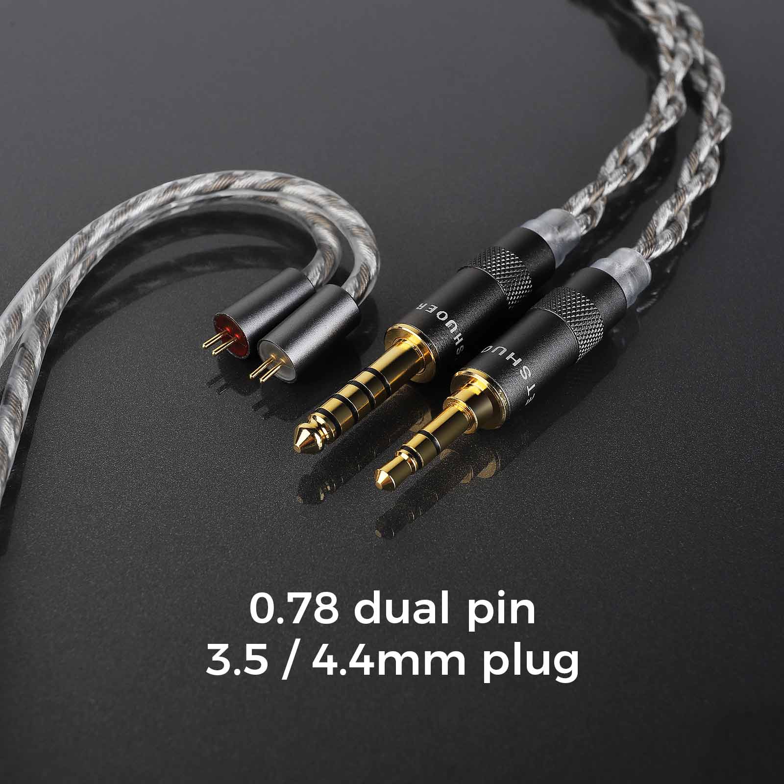 0,78-mm-Doppelstift ist ein weithin akzeptierter Standard, der mit vielen IEMs funktioniert. Die Wahl zwischen 3,5-mm- und 4,4-mm-Stecker kann mit vielen Quellkomponenten kombiniert werden.