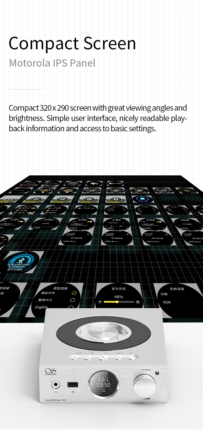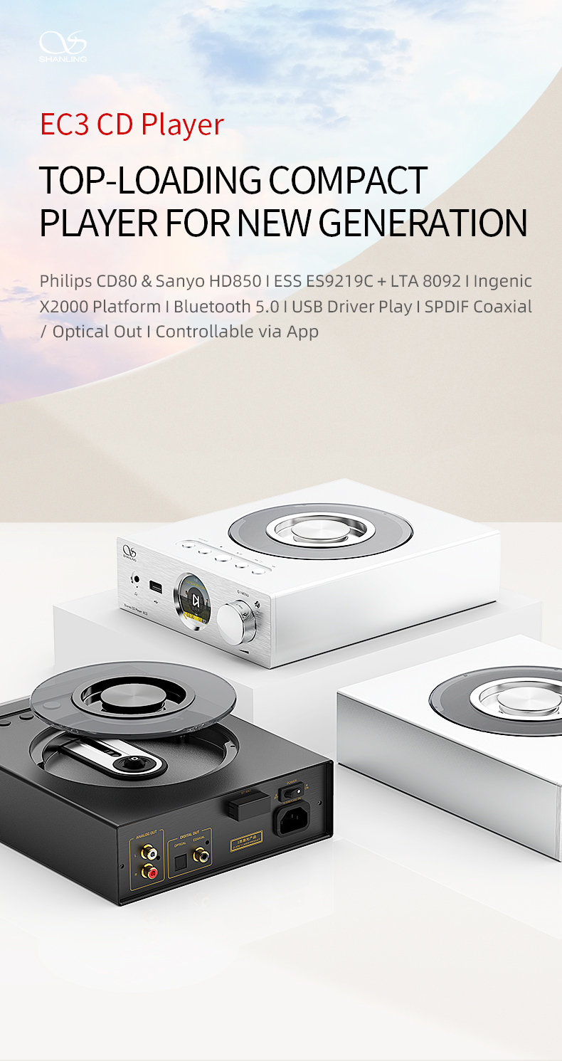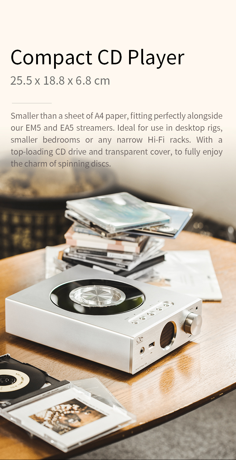 Kleiner als ein A4-Blatt, passt perfekt zu den Shanling EM5 und EA5 Streamern. Ideal für den Einsatz in Desktop-Rigs, kleineren Schlafzimmern oder engen Hi-Fi-Racks. Mit einem von oben zu ladenden CD-Laufwerk und einer transparenten Abdeckung, damit Sie den Charme der sich drehenden Discs voll genießen können.