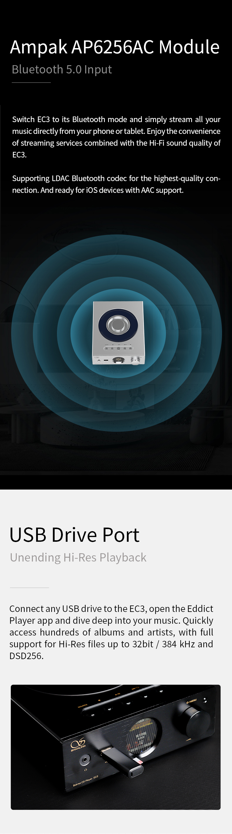 Schalten Sie den Shanling EC3 in den Bluetooth-Modus und streamen Sie Ihre Musik einfach direkt von Ihrem Telefon oder Tablet. Genießen Sie den Komfort von Streaming-Diensten in Kombination mit der Hi-Fi-Soundqualität des EC3. Unterstützung des LDAC-Bluetooth-Codecs für die hochwertigste Verbindung. Und bereit für iOS-Geräte mit AAC-Unterstützung.