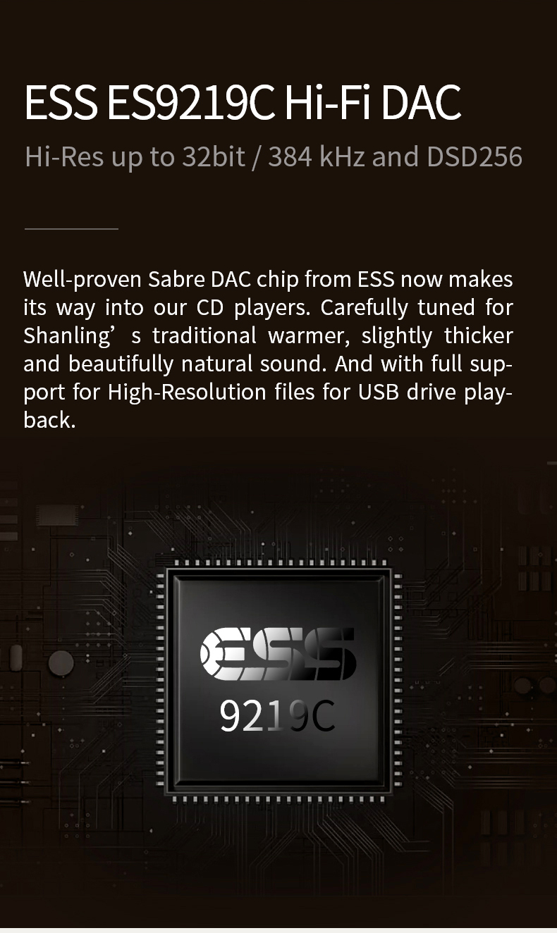 Der bewährte Sabre DAC Chip von ESS findet seinen Weg in unsere CD-Player. Sorgfältig abgestimmt auf den traditionellen wärmeren, etwas dickeren und wunderbar natürlichen Klang von Shanling. Und mit voller Unterstützung für High-Resolution-Dateien oder USB-Laufwerk-Wiedergabe.