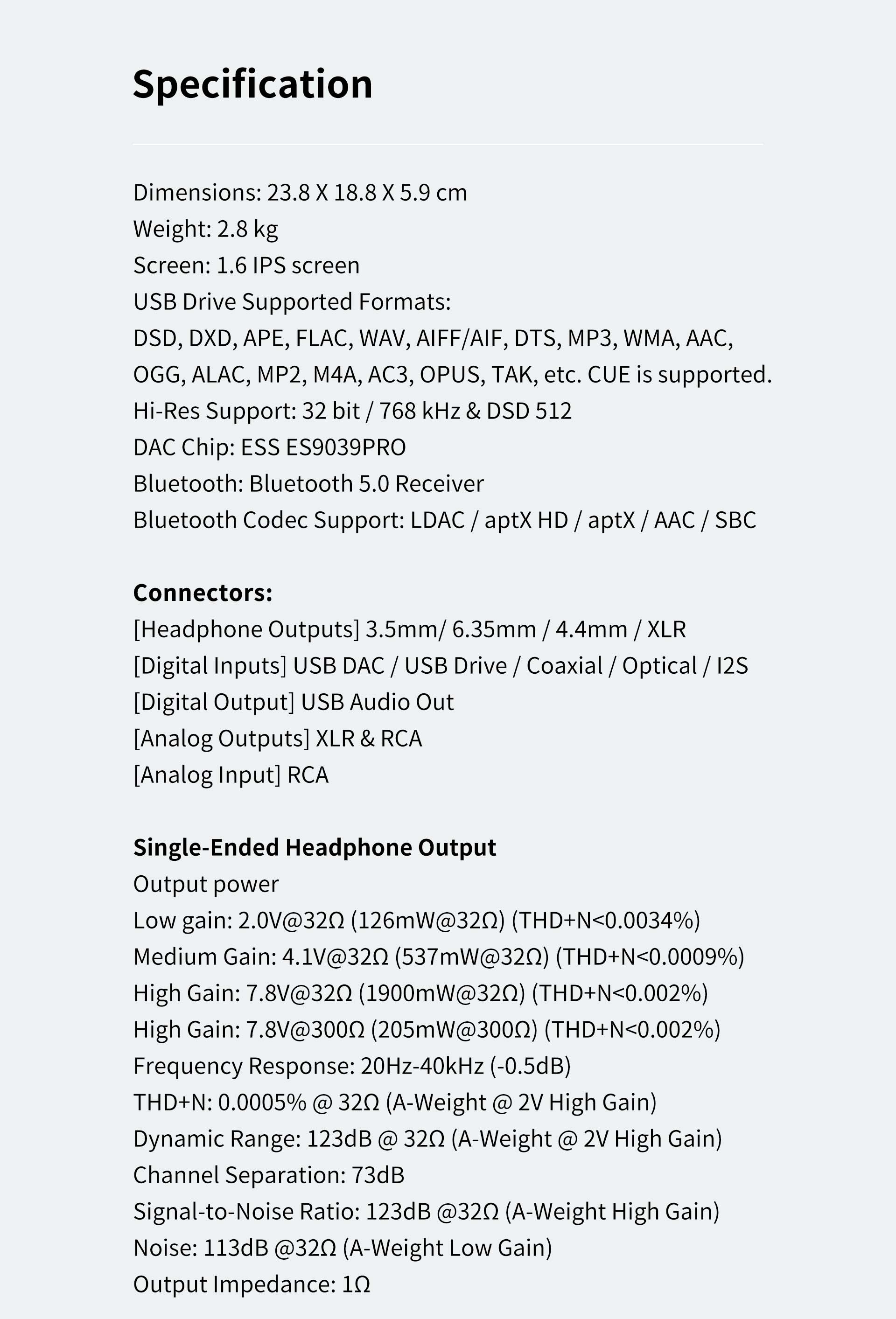 • Signal-Rausch-Verhältnis: 123 dB bei 32 Ω (Gewicht mit hoher Verstärkung