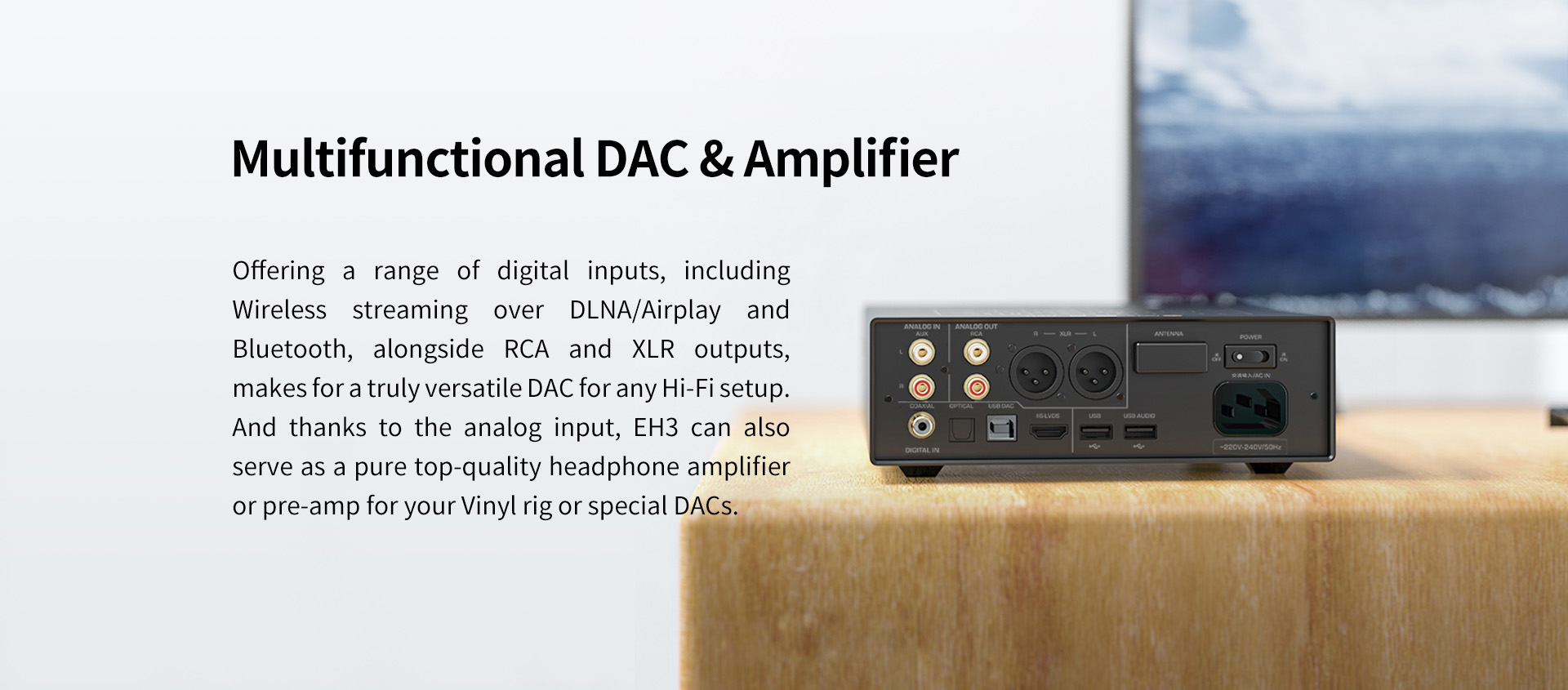 Der EH3 ist für die kabellose Wiedergabe ausgestattet und verfügt über Bluetooth 5.0 und 2.4G/5G Wi-Fi Fähigkeiten. Er kann als Bluetooth-Empfänger fungieren und unterstützt LDAC-, AAC- und SBC-Codecs. Darüber hinaus lässt er sich nahtlos in lokale Wi-Fi-Netzwerke integrieren und dient als Airplay 1- oder DLNA-Endpunkt. Die Rückseite bietet eine Vielzahl von Ein- und Ausgängen, darunter USB, optische, koaxiale und I²S-HDMI-Anschlüsse für die DAC-Nutzung sowie analoge RCA-Eingänge für reine Verstärkerfunktionen.