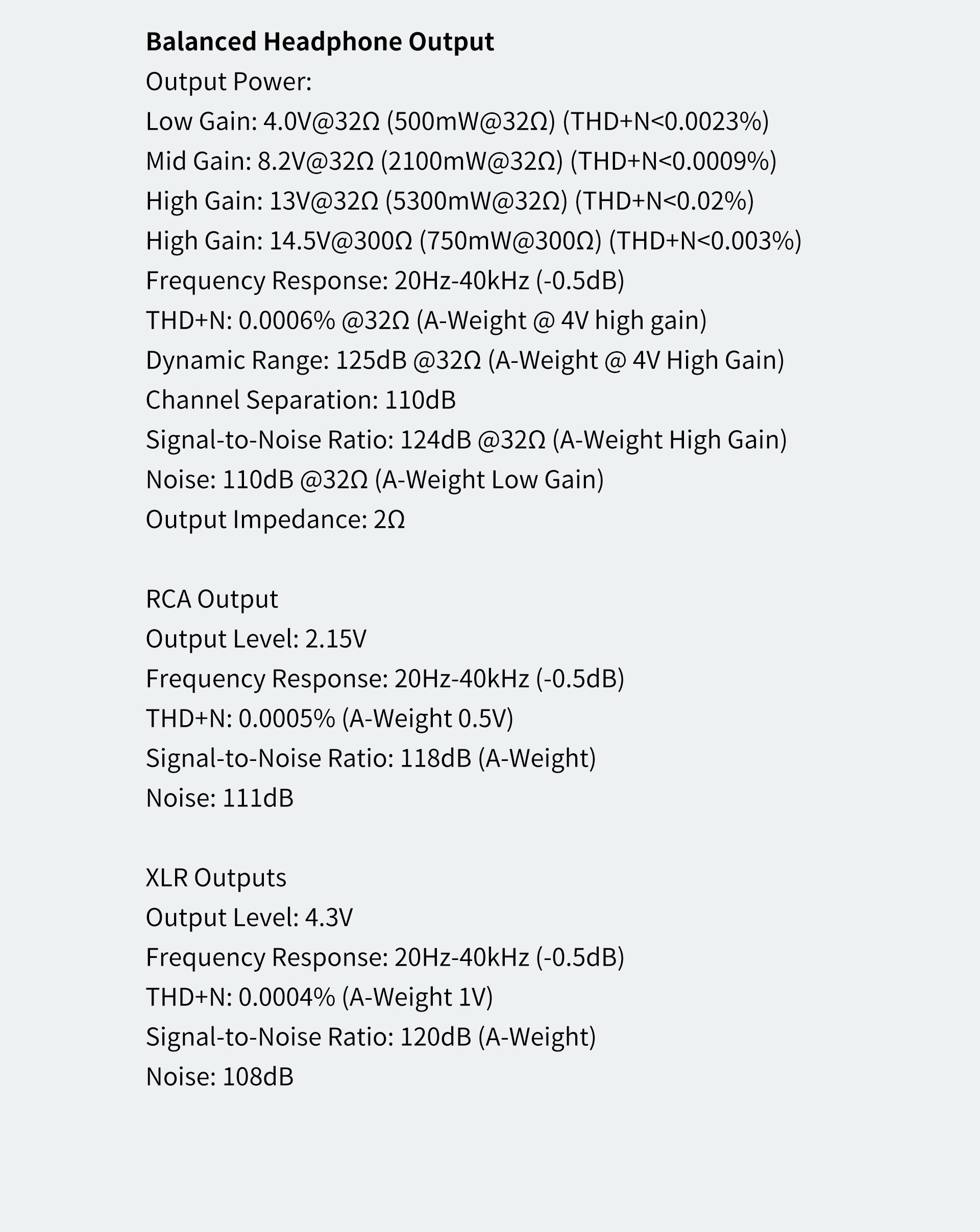 • Dynamikbereich: 123 dB bei 32 Ω (A-Gewicht, hohe Verstärkung).