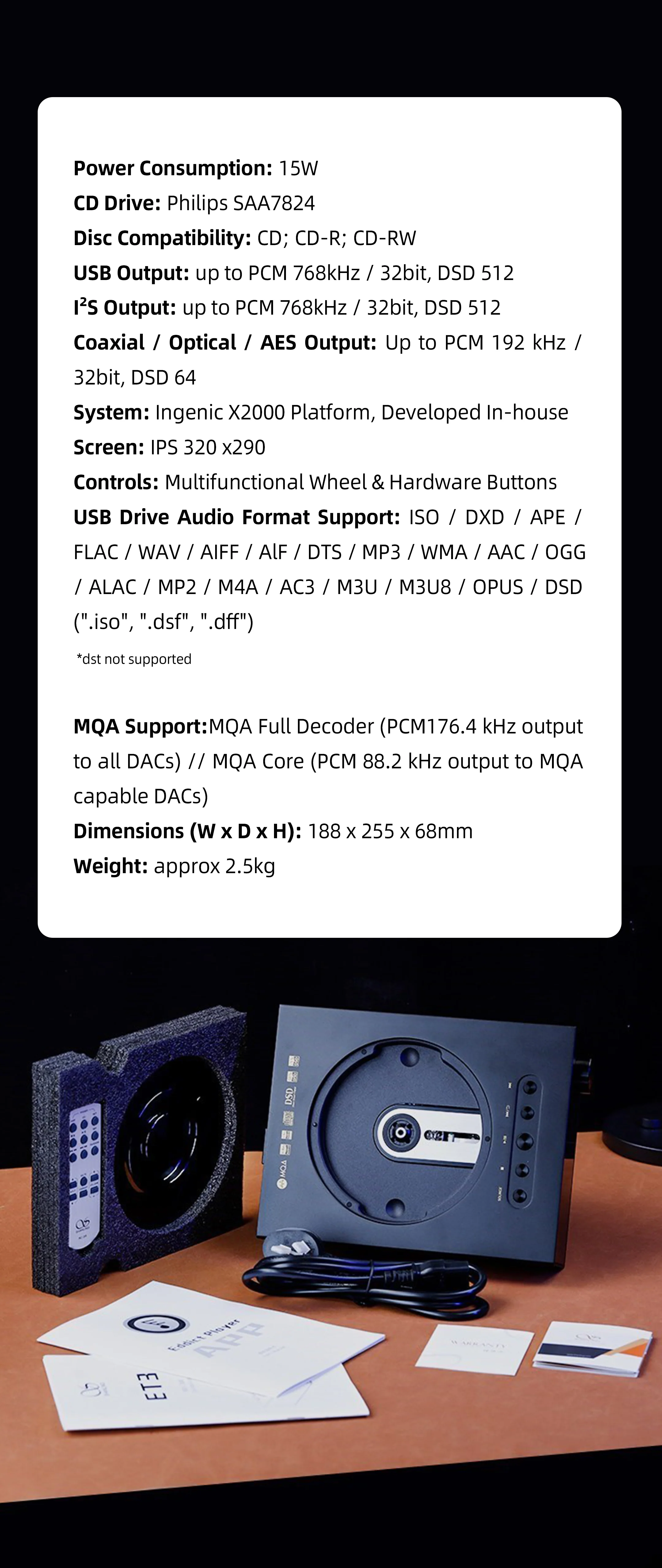 Der Shanling ET3 verwendet den leistungsstarken Dual-Core-Chip Ingenic X2000. Dieser Chip ist der erste auf dem Xburst2 basierende Chip, der nicht nur die Rechenleistung deutlich verbessert, sondern auch eine geringe Latenz beim Start ermöglicht. ET3 ist Dual-Band WiFi-fähig und unterstützt mehrere Wiedergabemethoden (ALNA, AirPlay, NAS). Er ist mit dem Upscaling-Chip CT7302CL ausgestattet, der sowohl All to DSD als auch All to PCM realisieren kann. Außerdem sorgt das CD-Laufwerk des Philips SAA7824 für eine sehr stabile Leistung.