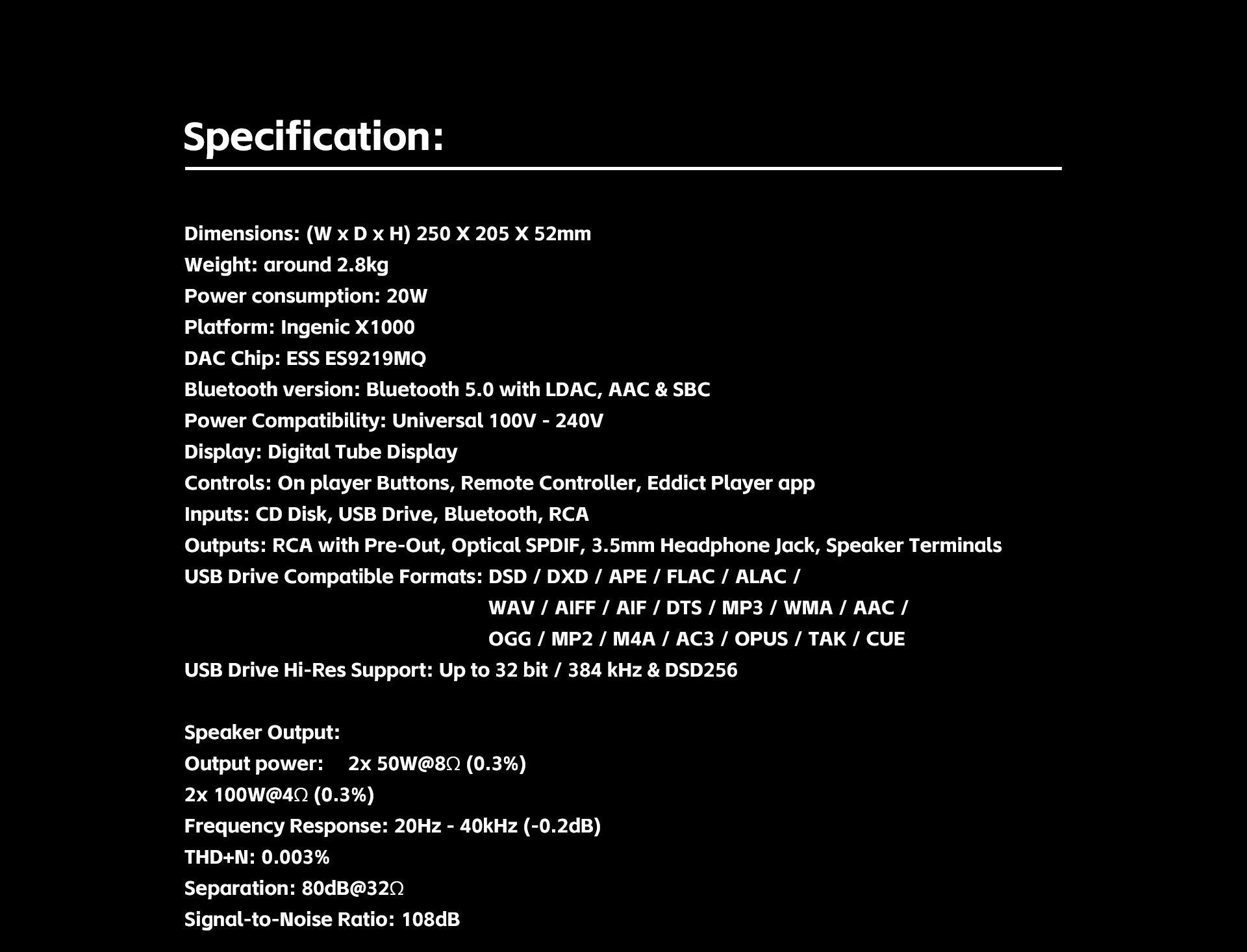 - U-Disk-Wiedergabeformat: DSD / DXD / APE / FLAC / ALAC / WAV / AIFF / AIF / DTS / MP3 / WMA / AAC / OGG / MP2 / M4A / AC3 / OPUS / TAK / Cue
