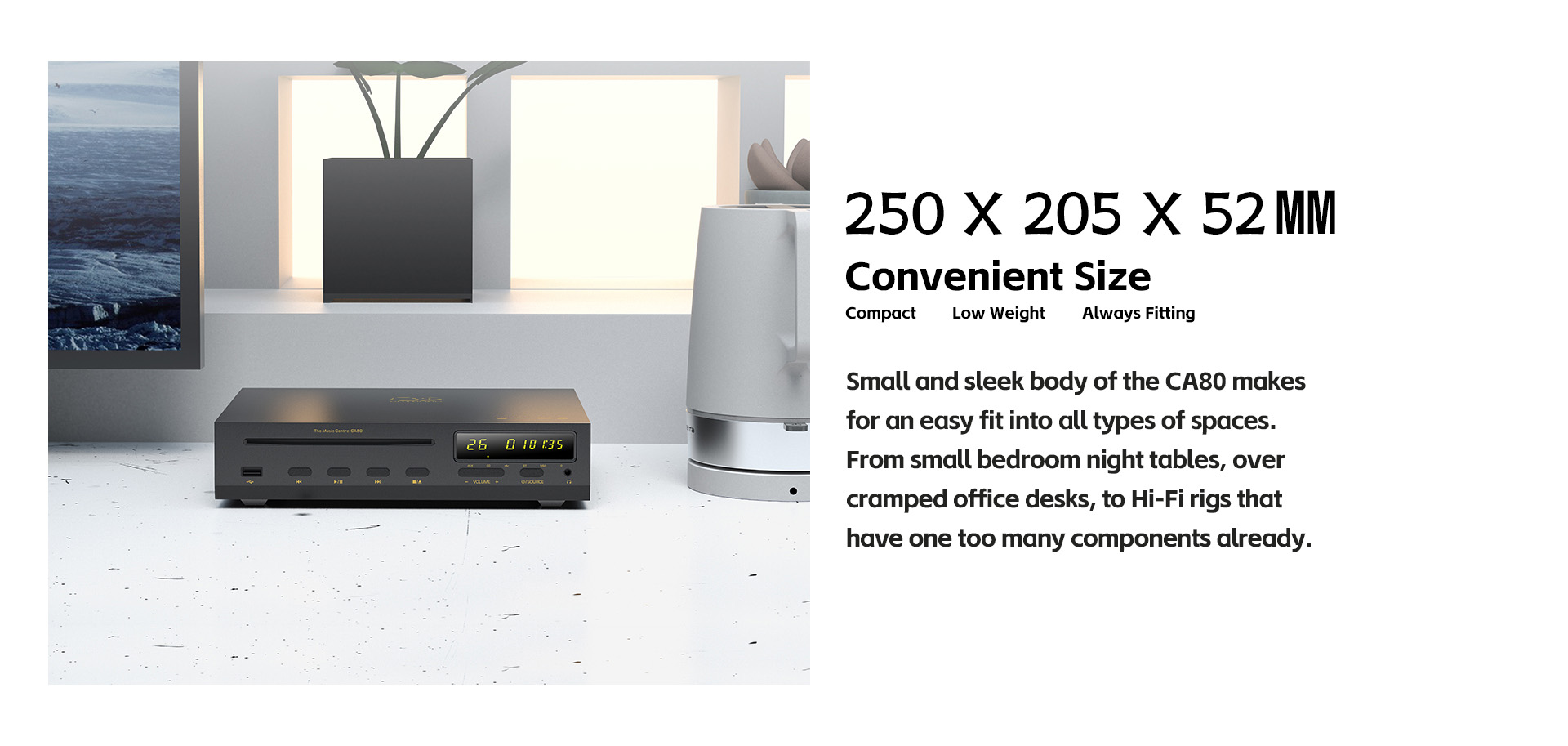 Das CA80 zeichnet sich durch seine kompakten Abmessungen von 25 x 20,5 x 5,2 cm und ein Gewicht von 2,4 kg aus. Diese Eigenschaften machen ihn anpassungsfähig an verschiedene Umgebungen und Anwendungen und fügen sich nahtlos in jede Benutzerumgebung ein. Die Vielseitigkeit des Players wird außerdem durch die Unterstützung des MQA-CD-Formats unterstrichen, was die Kompatibilität mit High-Fidelity-Musikdecodierung und -wiedergabe erhöht. Insgesamt ist der Shanling CA80 ein Beispiel für die harmonische Verschmelzung von erstklassigen Audiofunktionen und modernen Annehmlichkeiten, die für ein unvergleichliches Musikerlebnis sorgen, das ein breites Spektrum von Audiophilen anspricht.