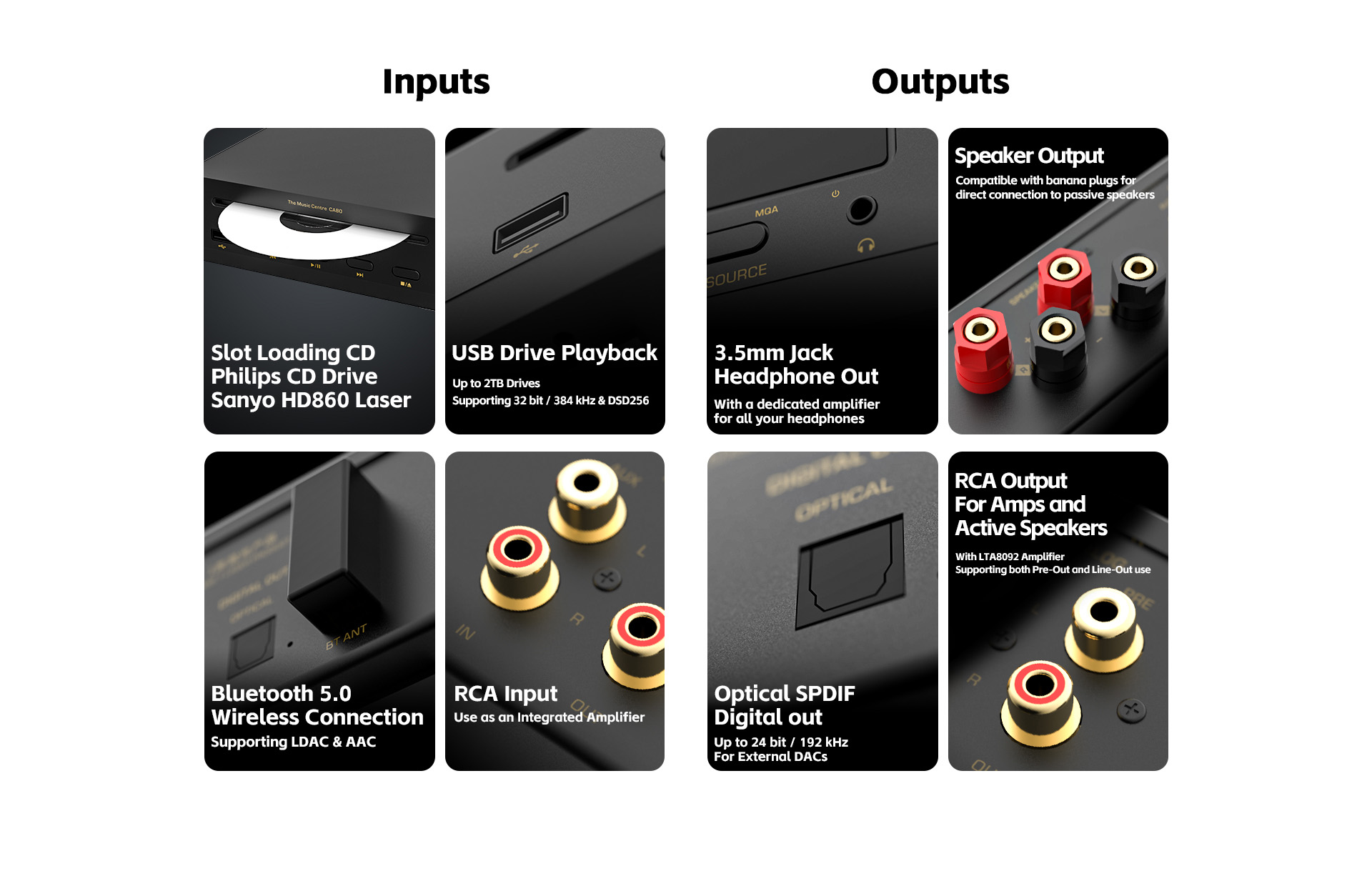 - 3,5-mm Kopfhörerausgang und RCA-Analogausgängen und Eingängen