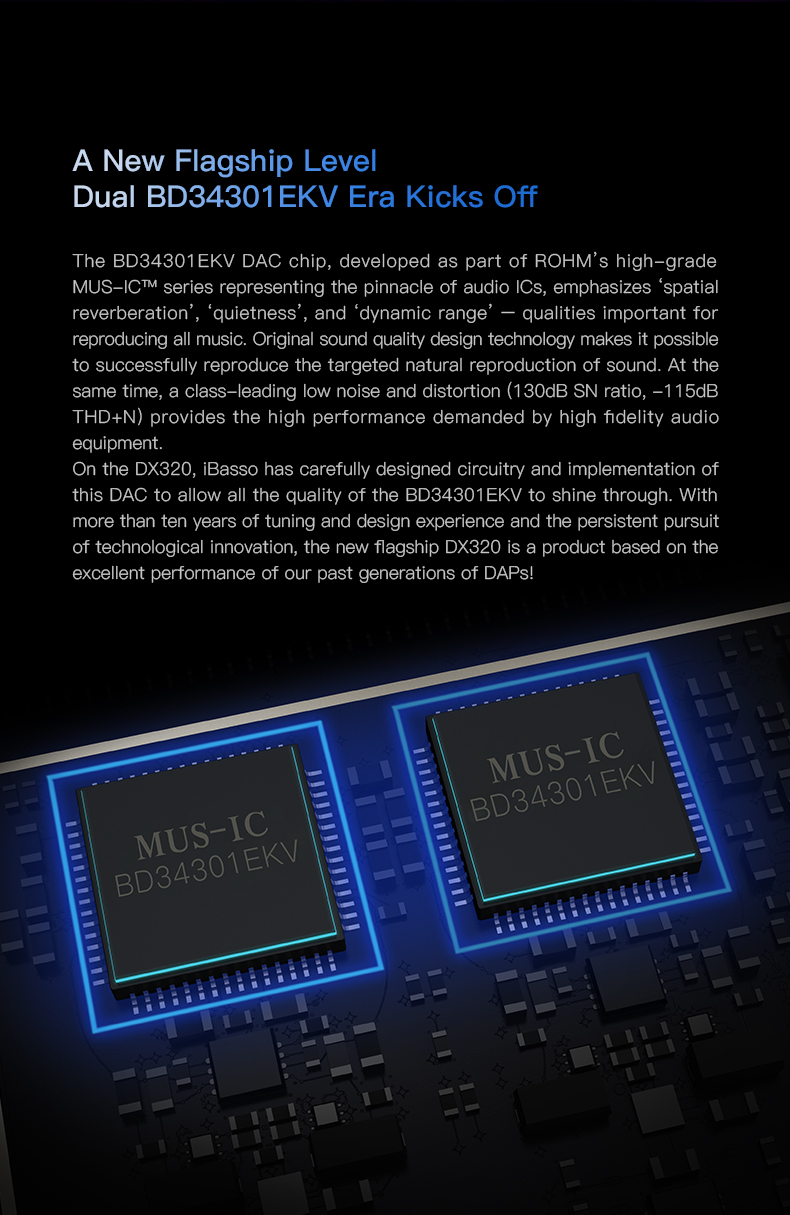 Der ND34301EKV DAC Chip aus der High End Serie von Rohm ist der Höhepunkt der momentan verfügbaren Audiobauteile in Bezug auf die Hervorhebung von räumlicher Darstellung und des Dynamikbereiches. In Kombination mit einer extrem niedrigen Verzerrung (130dB SN ratio, -115dB THD+N) spielt der iBasso DX320 in der Liga der Referenzplayer.