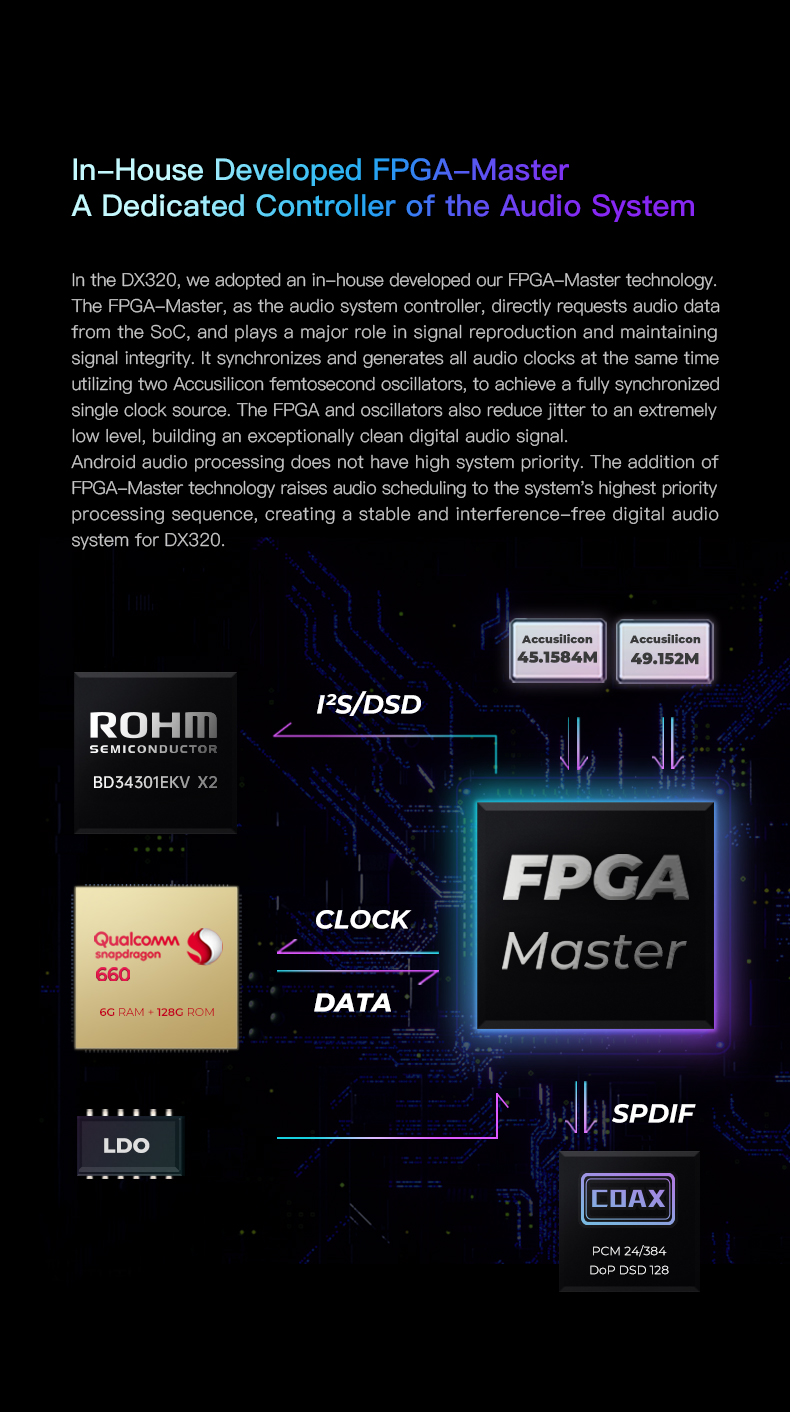 Der FPGA Master fungiert als Schaltzentrale der Audiodaten und spielt eine Hauptrolle bei der Reproduktion der Signalqualität. Da Android Systeme von Haus keine Priorität auf die Audioverarbeitung legen, ist diese Entwicklung klanglich ein großer Schritt.