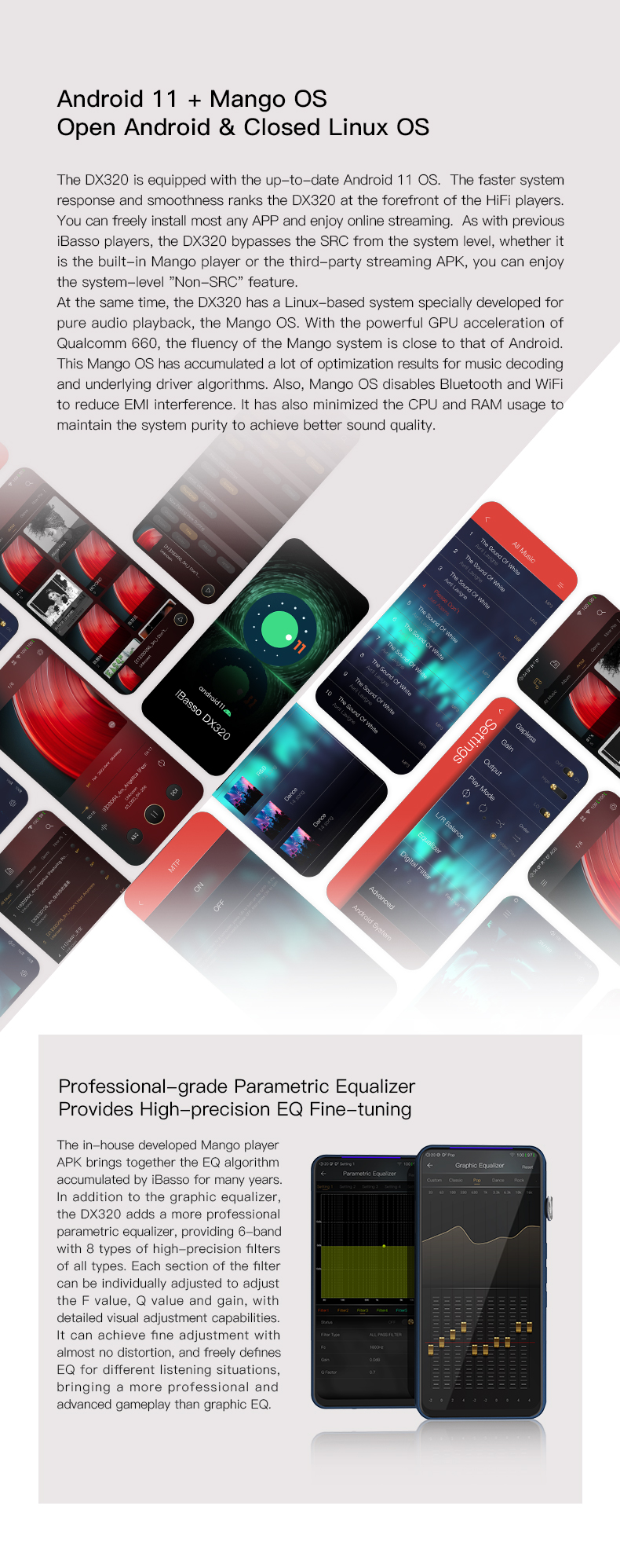 - Mango OS: der DX320 kann mit dem auf Linux basierten Mango OS als reiner Musik-Player ohne Android genutzt werden für einen puristischen Musikgenuss