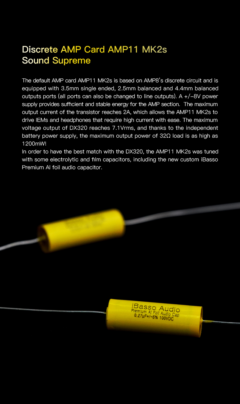Ausgestattet mit einer 3,5mm Buchse und symmetrischen 2,5mm und 4,4mm Buchsen ist das AMP11 MK2s ein Multitalent. Das Modul leistet bei 32Ohm Kopfhörern unglaubliche 1200mW Ausgangsleistung. Damit ist das Leistungspotential auf für hochohmige Kopfhörer gegeben. Bei 300Ohm Kopfhörern liefern die symmetrischen Ausgänge 168mW.