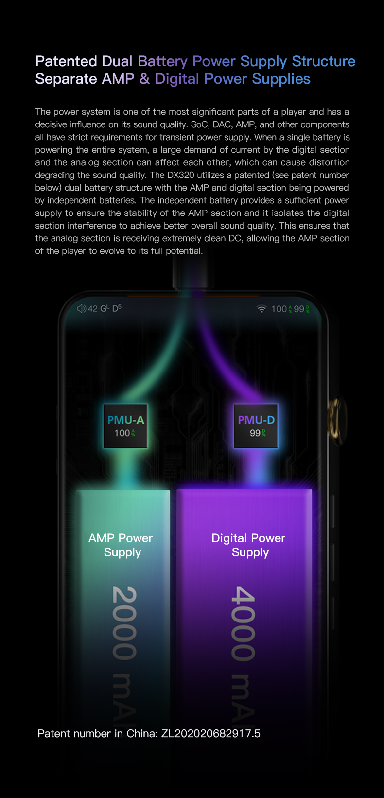 Eine konsequente Trennung der Stromversorgung für die analogen und digitalen Sektionen des iBasso DX320 sorgen für eine für sauberen Klang aufgrund einer sauberen Stromversorgung, damit die klangliche Signalverarbeitung frei von Artefakten ist.